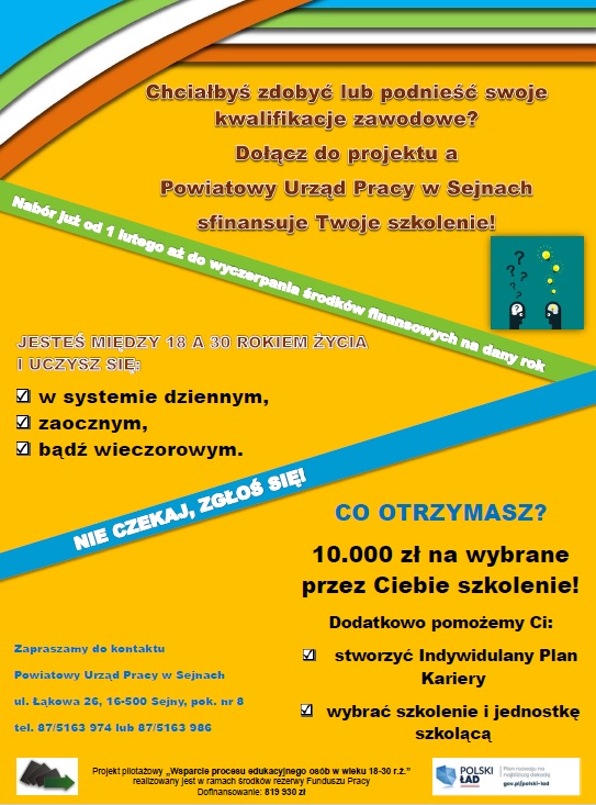 Powiatowy Urząd Pracy w Sejnach uzyskał dofinansowanie Ministra Rodziny i Polityki Społecznej jako jeden z 73 urzędów pracy w Polsce na realizację projektu pilotażowego „Wsparcie procesu edukacyjnego osób w wieku 18-30 r.ż.” i wraz z początkiem lutego br. rozpoczyna jego realizację.