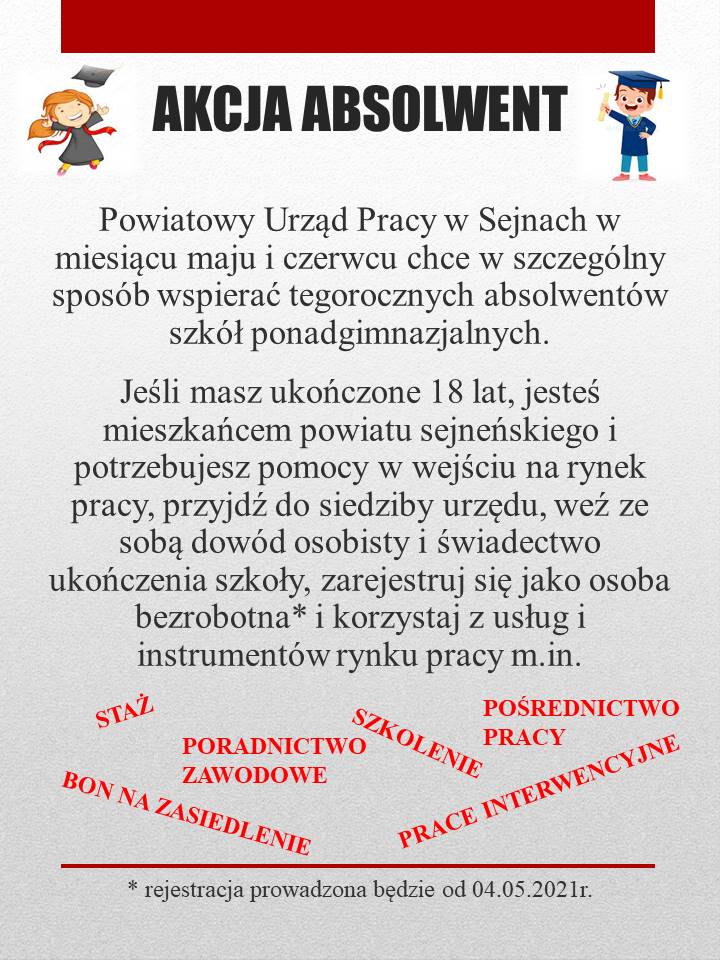 Akcja ABSOLWENT lista wpisów Powiatowy Urząd Pracy w Sejnach oferuje wsparcie tegorocznym absolwentom szkół ponadgimnazjalnych. Zachęcamy do zapoznania się z ofertą.