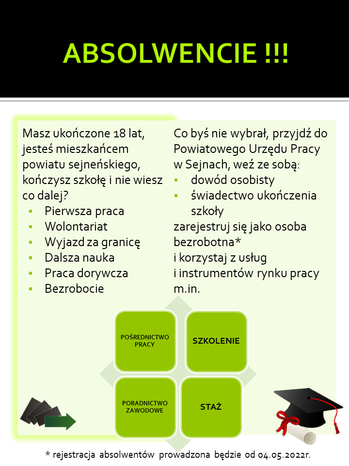 Akcja ABSOLWENT lista wpisów Zachęcamy do skorzystania z oferty Powiatowego Urzędu Pracy w Sejnach skierowanej do uczniów klas czwartych, którzy już wkrótce zakończą edukację w naszej szkole.