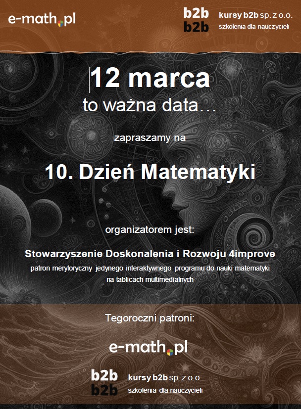 W tym roku zgodnie z hasłem przewodnim „12 marca to ważna data” przy współpracy ze Stowarzyszeniem Doskonalenia i Rozwoju 4improve (patron merytoryczny e-math.pl), młodzież rozwiązywała zadania dotyczące wydarzeń, które miały miejsce w dniu 12 marca na przestrzeni wielu lat, a nawet wieków.