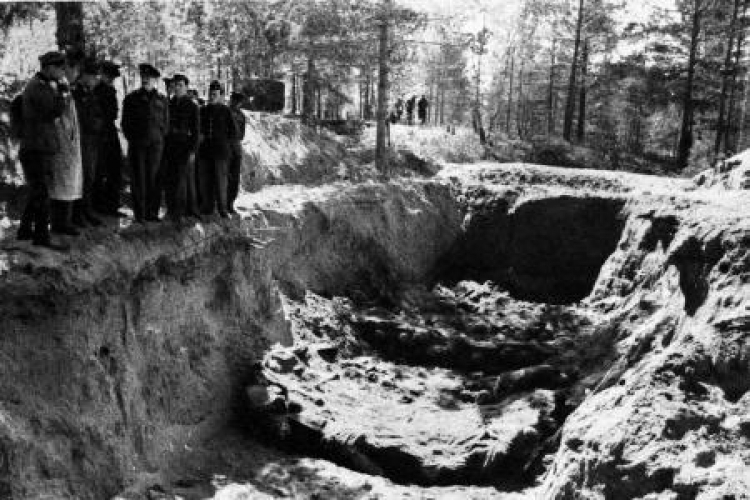 Odsłonięty grób w lesie katyńskim. Zdjęcie z 1943 r. Fot PAP/Archiwum (źródło)