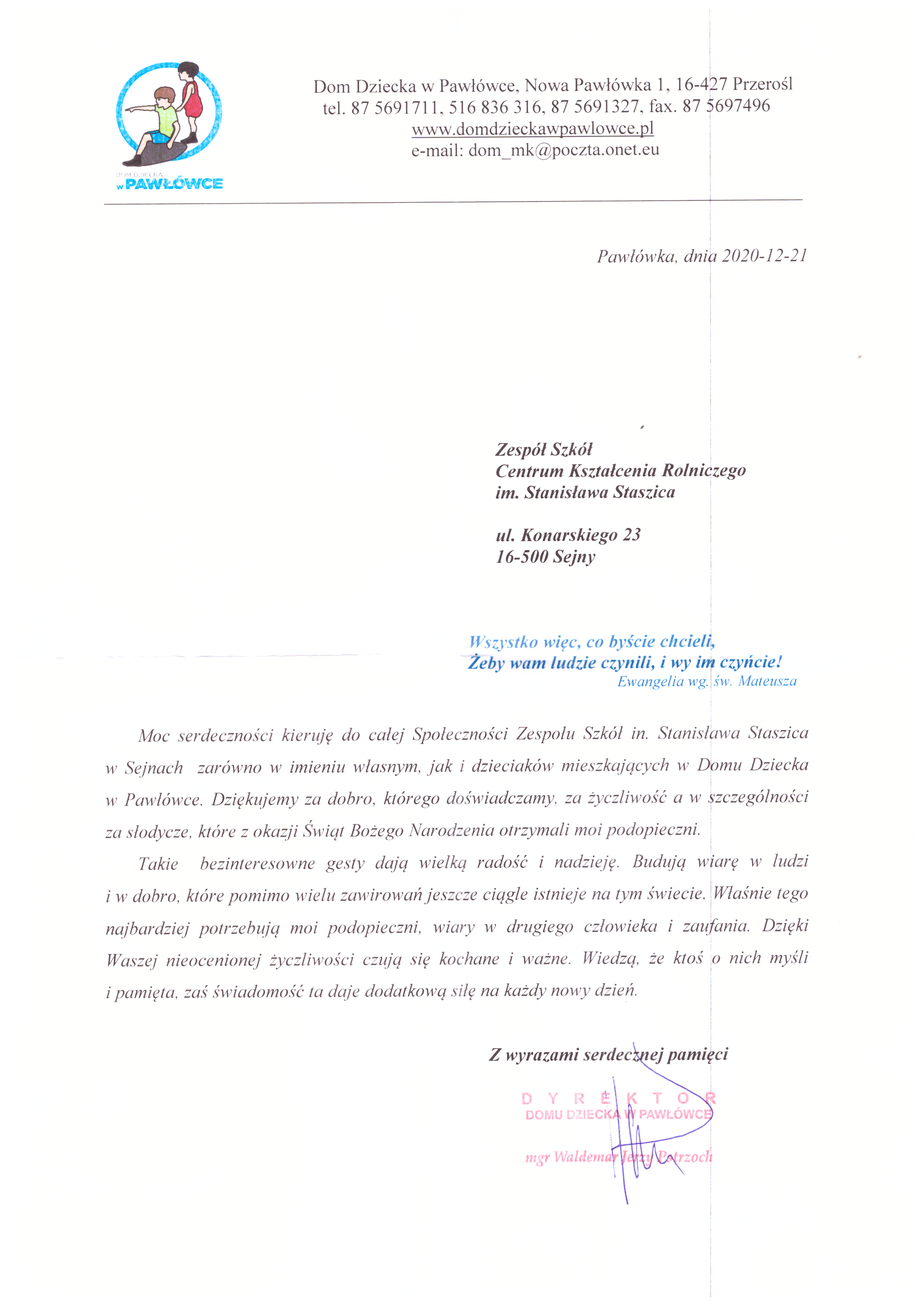 21 grudnia zakończyła się zbiórka słodkości dla dzieci przebywających w Domu Dziecka w Pawłówce. Tego samego dnia za sprawą pani pedagog upominki trafiły do adresatów.