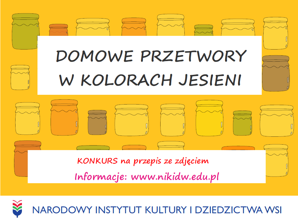 Narodowy Instytut Kultury i Dziedzictwa Wsi ogłasza nowy jesienny konkurs pn. „Domowe przetwory w kolorach jesieni - konkurs na przepis ze zdjęciem”. Jego celem jest dokumentowanie tradycyjnych i nowoczesnych domowych sposobów utrwalania żywności oraz ich szeroka popularyzacja. Dla autorów najciekawszych przepisów przewidziane są nagrody pieniężne.