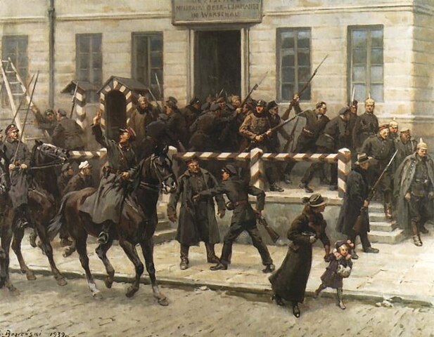 Obraz Stanisława Bagieńskiego "Rozbrajanie Niemców przed Główną Komendą na Placu Saskim w Warszawie"