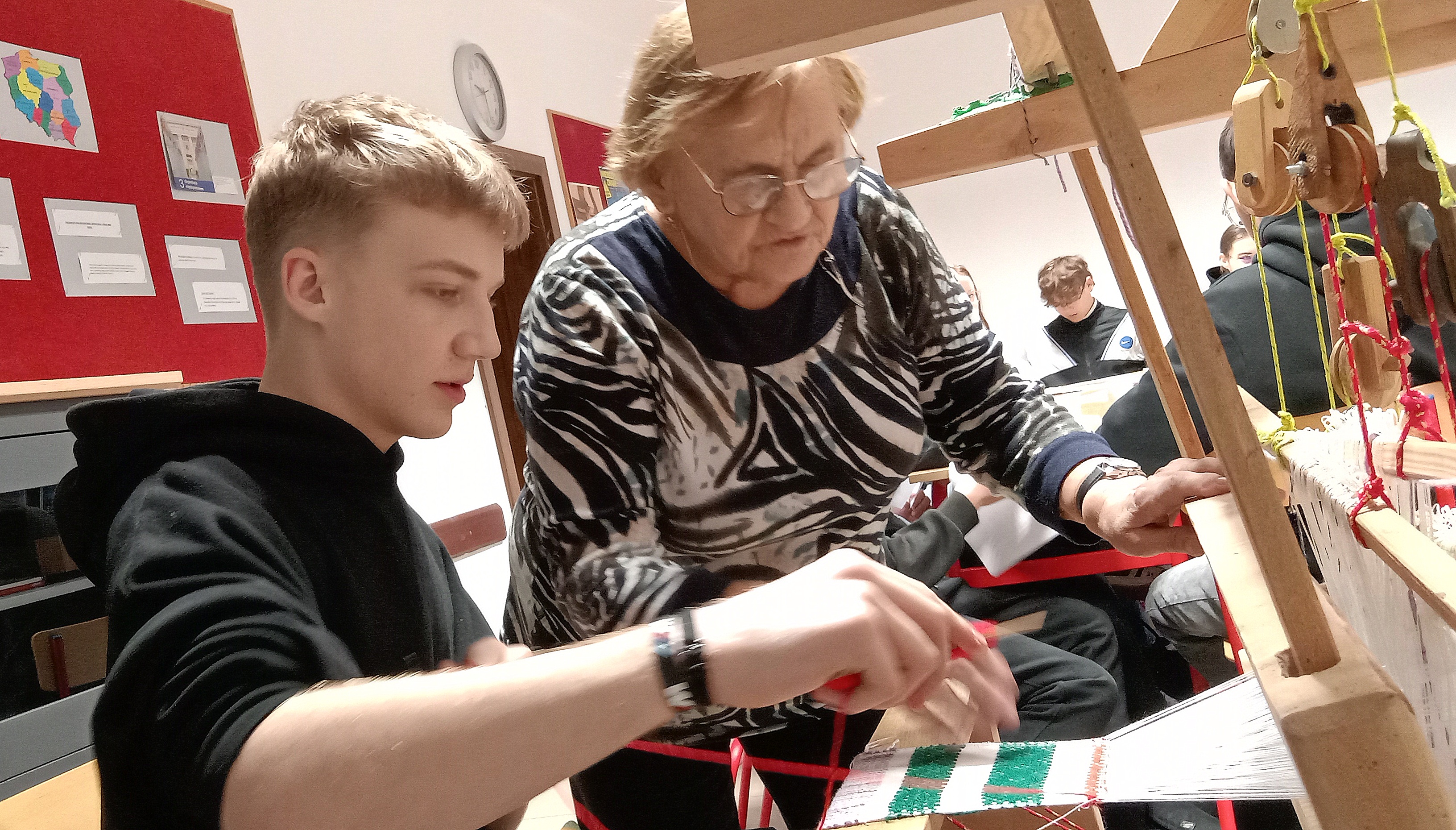 Największym wyzwaniem okazała się praca na prawdziwym krośnie. Pani Sabina, doświadczona tkaczka z okolic Augustowa, z wielką cierpliwością i zaangażowaniem wspierała śmiałków, którzy odważyli się zmierzyć z tym zadaniem.