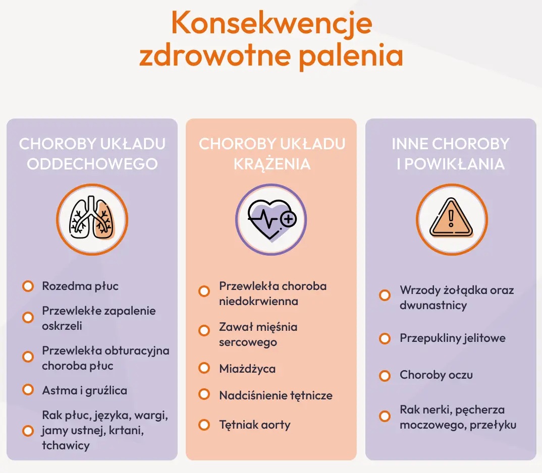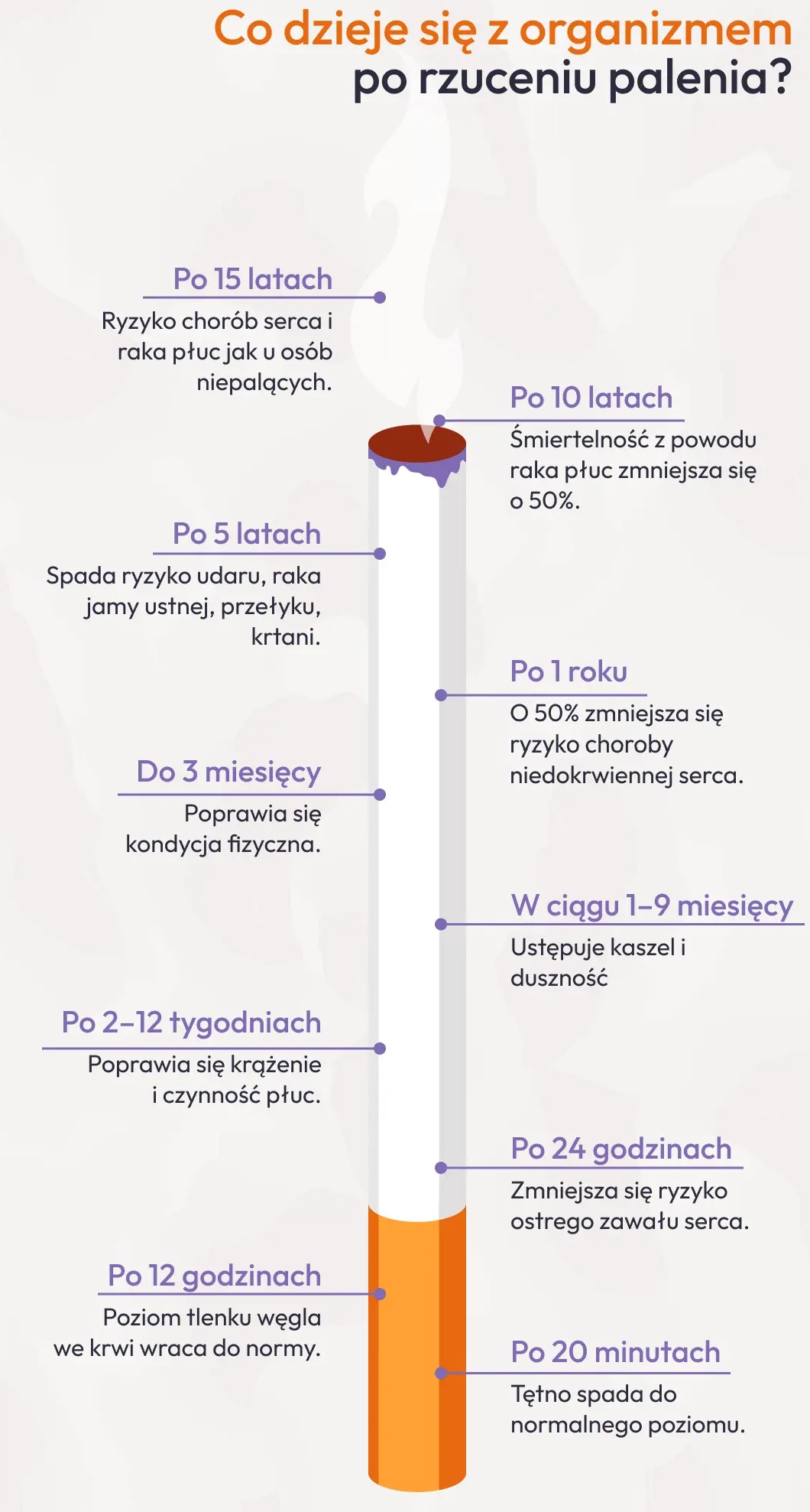 Proces regeneracji organizmu po zaprzestaniu palenia rozpoczyna się niemal natychmiast. Już po ok. 20 minutach Twoje tętno i ciśnienie krwi zacznie się normować. Po dwóch dobach zauważysz poprawę zmysłu smaku i węchu, po dwóch tygodniach lepszą wydolność oddechową, a po roku ograniczysz ryzyko choroby niedokrwiennej serca nawet o połowę. Poniższa infografika wizualizuje, jakie dokładnie korzyści zdrowotne przynosi rzucenie palenia w perspektywie różnego czasu.