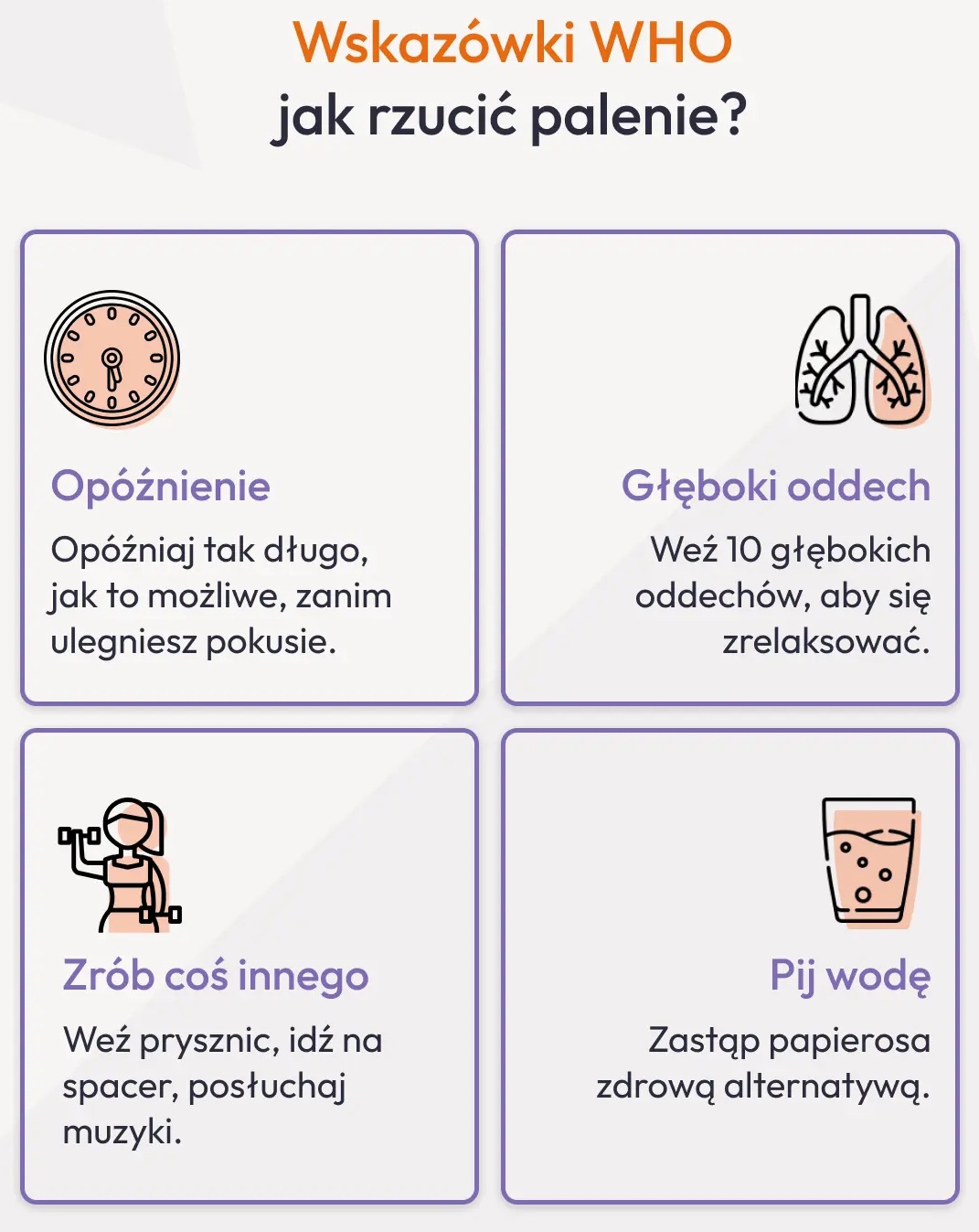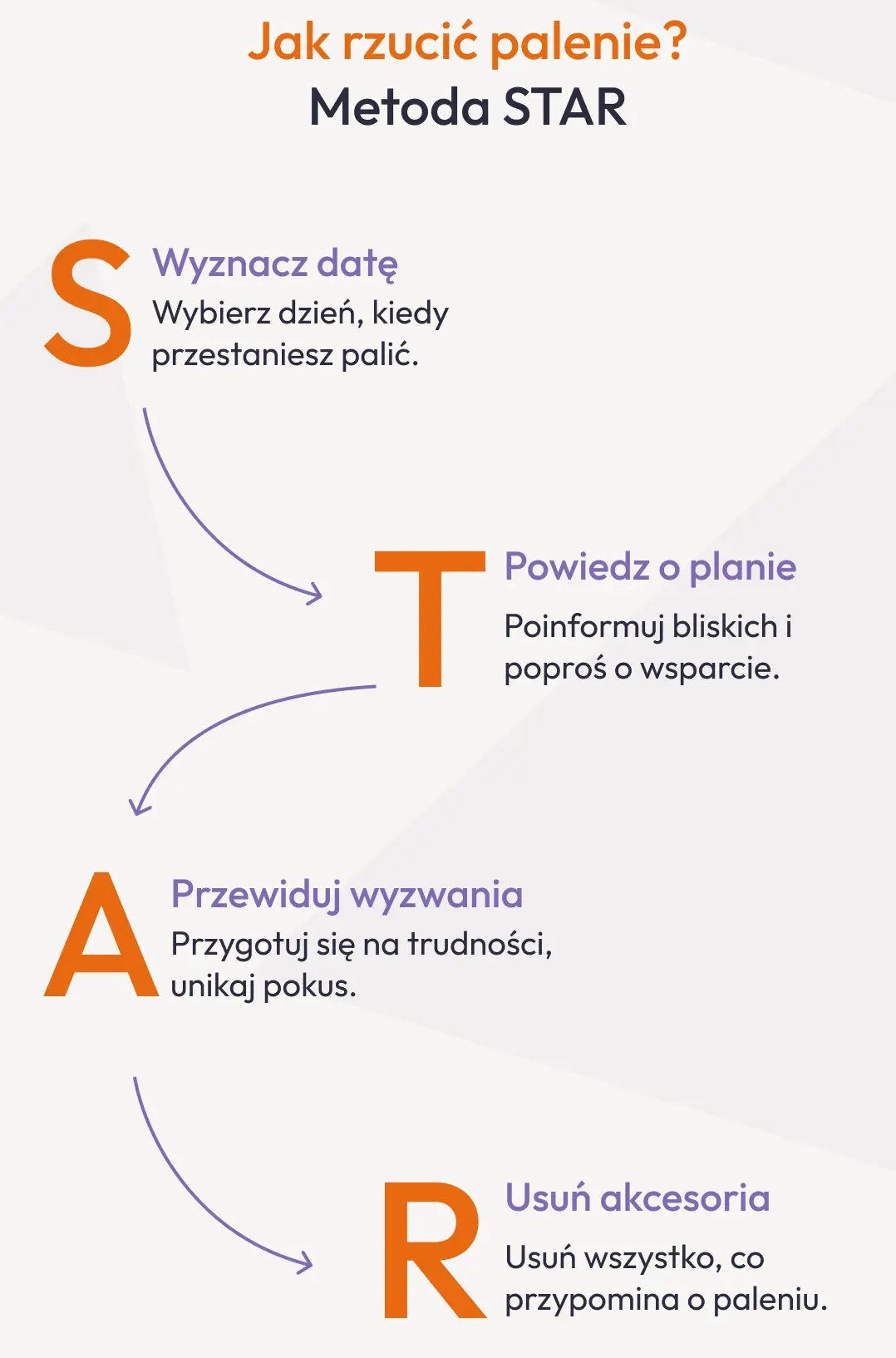 Rzucenie palenia to proces wymagający zaangażowania, ale jak najbardziej możliwy do zrealizowania. Miliony ludzi na świecie udowodniły, że można wyjść z nałogu – Ty również możesz to zrobić. Pamiętaj też, że nie jesteś w tym sam. Dostępne są sprawdzone strategie, narzędzia i metody wsparcia. Zacznij od podjęcia decyzji i opracuj plan rzucenia palenia, korzystając np. z metody STAR, zwizualizowanej na poniższej infografice.