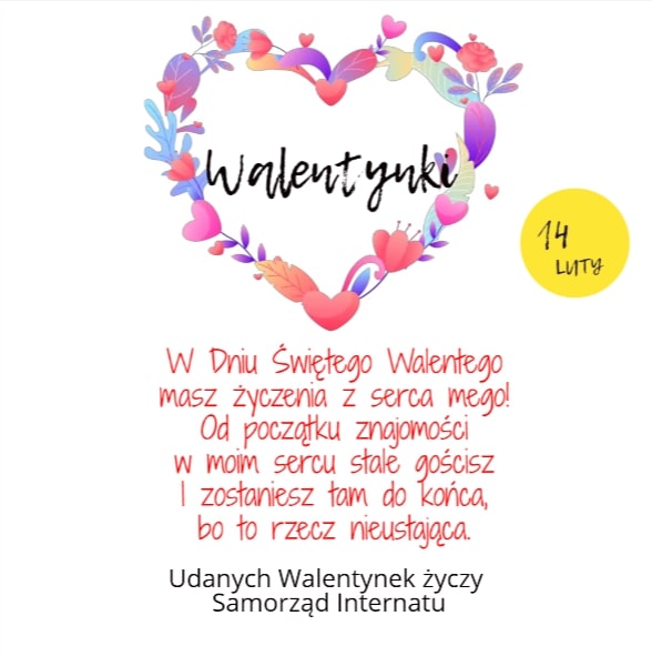 Co roku 14 lutego Samorząd Internatu organizował tzw. pocztę walentynkową. W tym wyjątkowym dniu wszyscy mieszkańcy mieli możliwość przekazania kartek z życzeniami lub drobnych upominków tym, którzy są bliscy ich sercu. Ze względu na sytuację epidemiczną, a tym samym nieobecność zdecydowanej większości mieszkańców w internacie, w tym roku walentynki nie mogą odbyć się w podobnej formie. Mimo wszystko samorząd życzy zakochanym szczęśliwego dnia św. Walentego! Dbajcie o siebie!