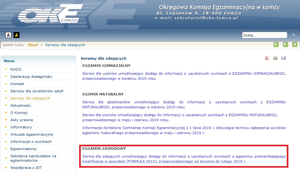 Wyniki dostępne będą na stronie OKE w Łomży. W menu po lewej stronie należy kliknąć SERWISY DLA ZDAJĄCYCH (instrukcja poniżej).